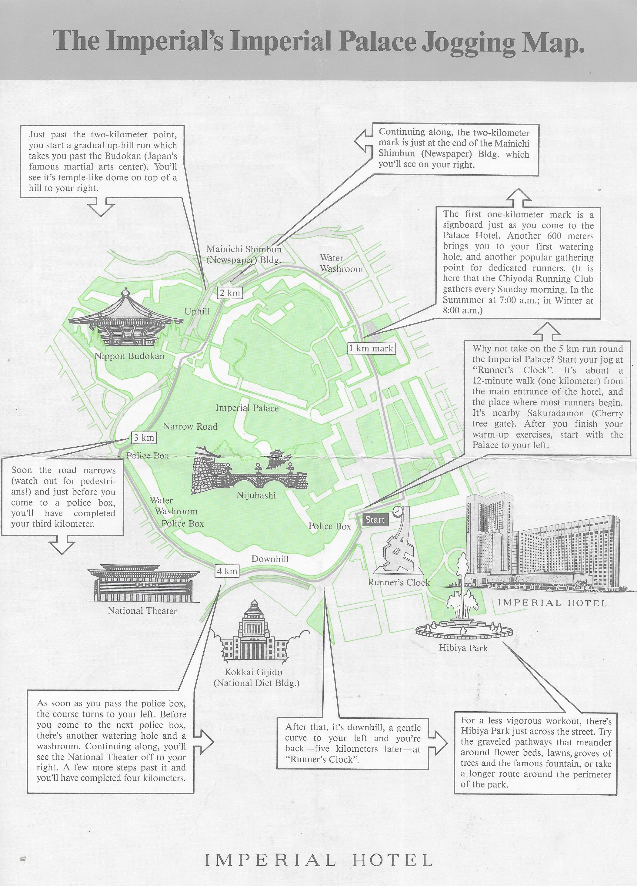 One problem in Tokyo was that there was no place to run. No matter where I was in the world, part of my daily routine was to do a 5 or 6 mile run before breakfast. I always stayed with friends or in hotels that were near parks where I could run. But that was not possible in Tokyo. The only viable spot for running was the Imperial Palace, and I usually stayed at the Imperial Hotel. There is a 5K loop around the Palace, so I did it twice.